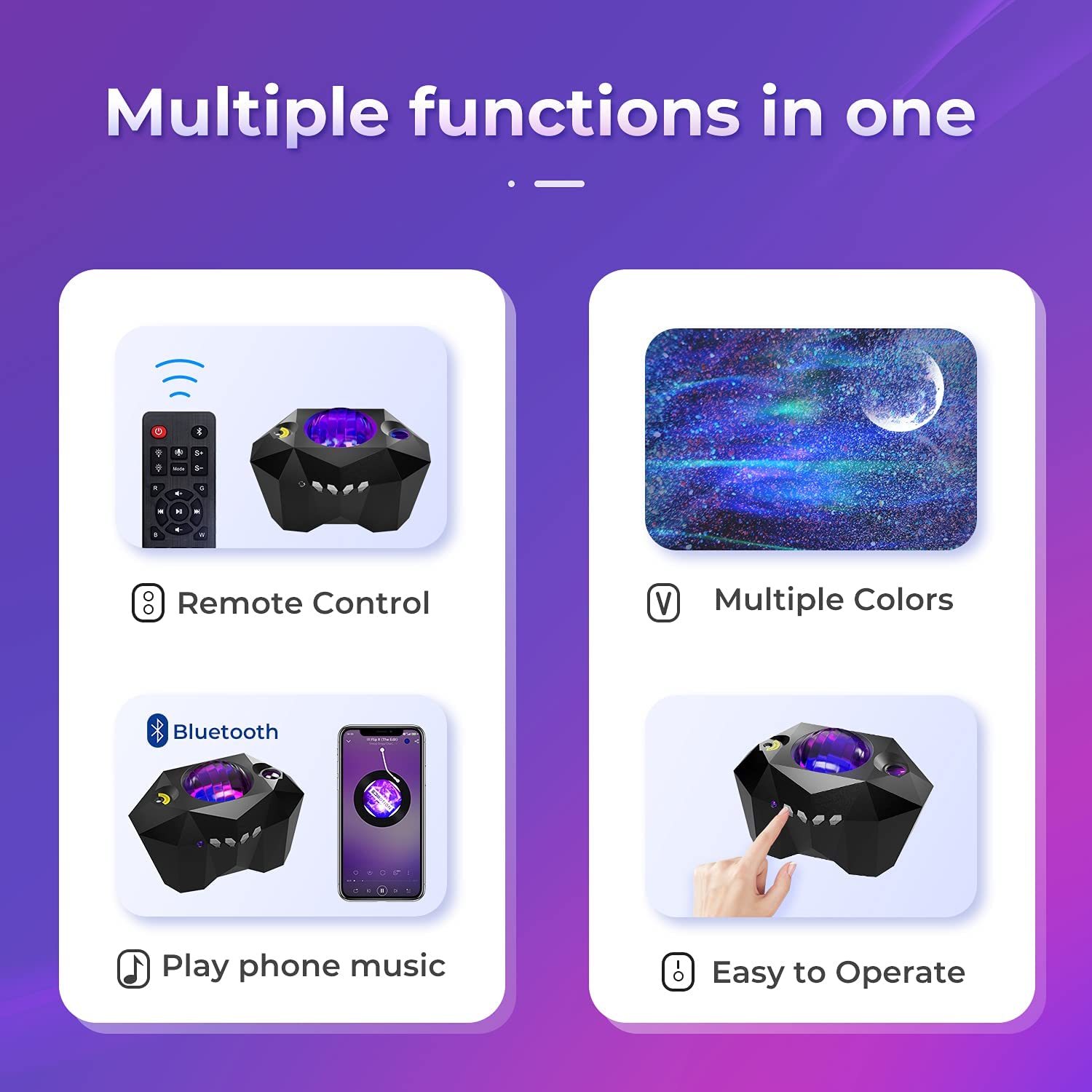 Works with smartphones via Bluetooth,play local music through mobile phone, then youâll see the light will change color with themusic beats.resulting in a starry sky projection.Voice Control(Only control the lights speed).